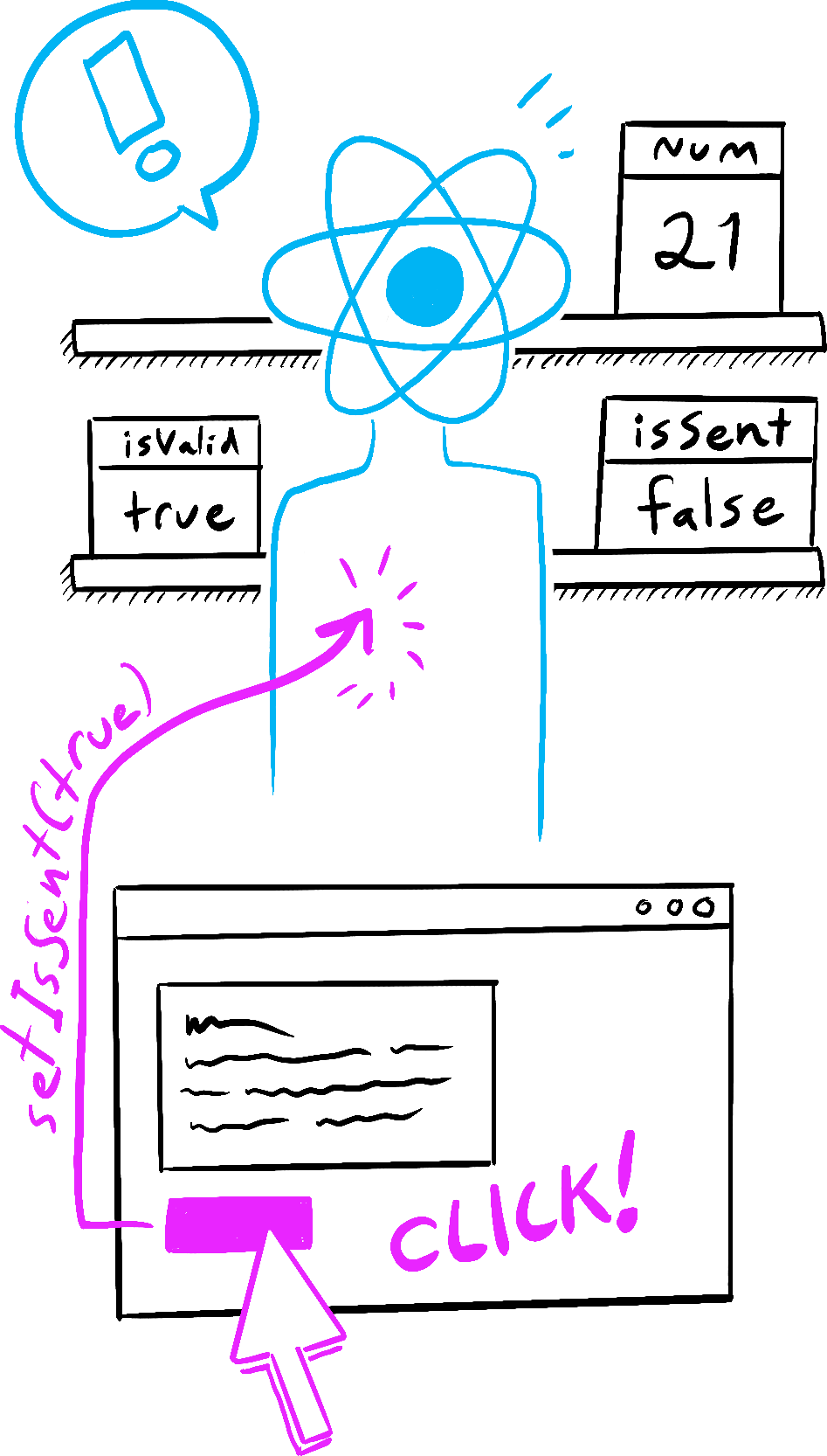 onSubmit이벤트 핸들러가 실행됩니다.setIsSent(true)가isSent를true로 설정하고 새로운 렌더링을 큐에 넣습니다.- React는 새로운